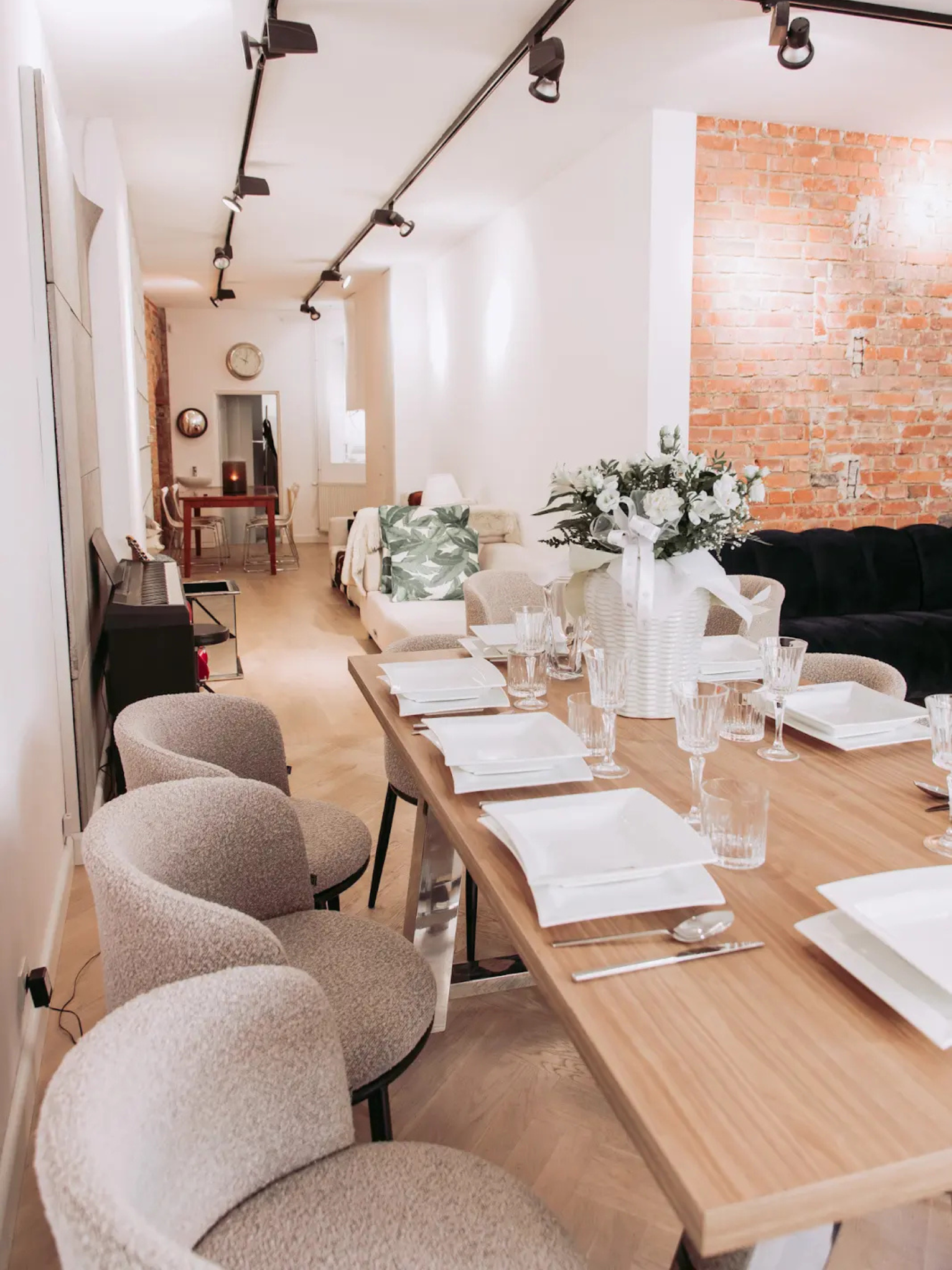 - Na miejscu: stoły, krzesła (Eichholtz/Milano), lniane tekstylia, biblioteka, Wi‑Fi, pianino elektryczne, podstawowe oświetlenie scenograficzne.